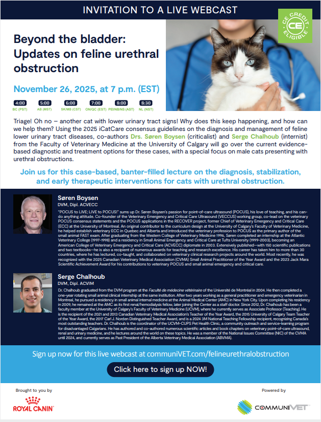 Live webcast presented by Dr. Soren Boysen and Dr. Serge Chalhoub. This webcast will be available for on-demand viewing afterwards at: https://www.communivet.com/en/ca/education/webcasts/updates-on-feline-urethral-obstruction