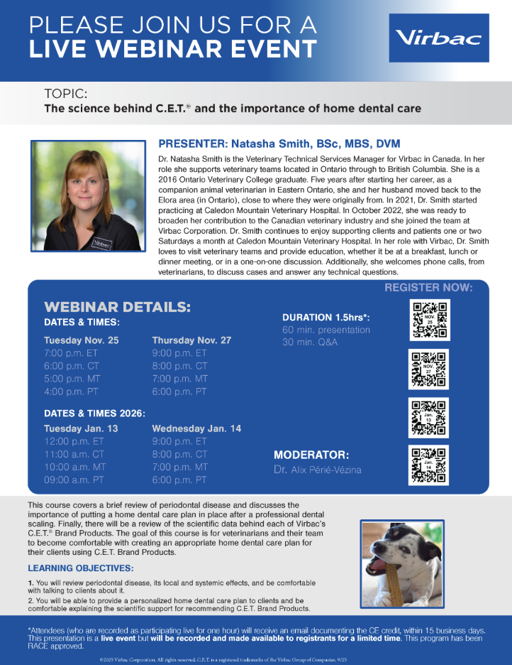 Dr. Natasha Smith is the Veterinary Technical Services Manager for Virbac in Canada. In her role she supports veterinary teams located in Ontario through to British Columbia. She is a 2016 Ontario Veterinary College graduate. Five years after starting her career, as a companion animal veterinarian in Eastern Ontario, she and her husband moved back to the Elora area (in Ontario), close to where they were originally from. In 2021, Dr. Smith started practicing at Caledon Mountain Veterinary Hospital. In October 2022, she was ready to broaden her contribution to the Canadian veterinary industry and she joined the team at Virbac Corporation. Dr. Smith continues to enjoy supporting clients and patients one or two Saturdays a month at Caledon Mountain Veterinary Hospital. In her role with Virbac, Dr. Smith