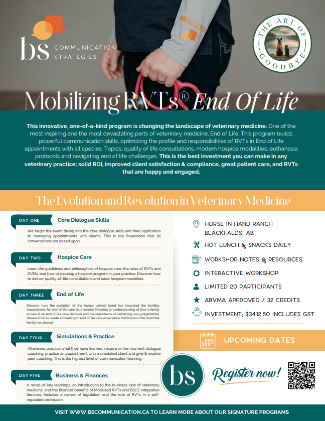 This one-of-a-kind program empowers RVTs to lead hospice and end-of-life care, turning a sensitive area of medicine into a professional and sustainable business service. It is a solid business investment that honors the human-animal bond while supporting clinic growth.